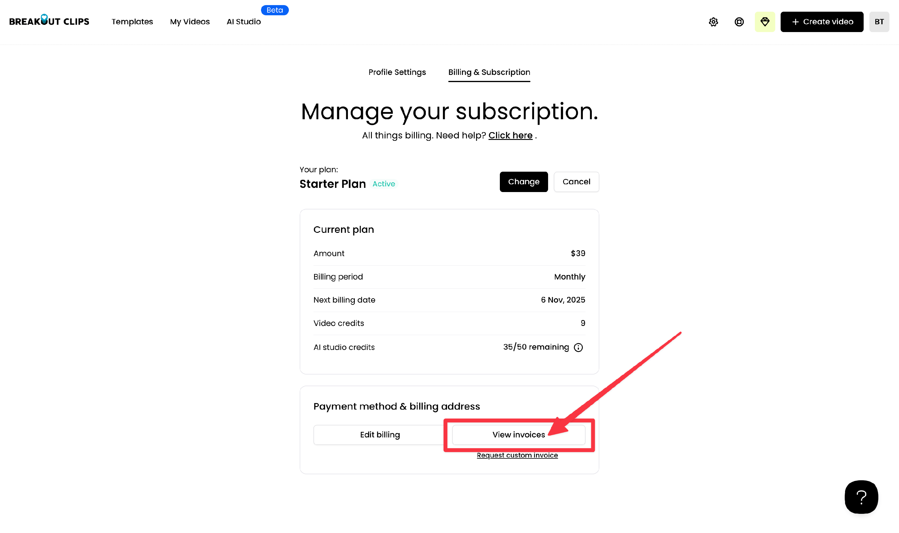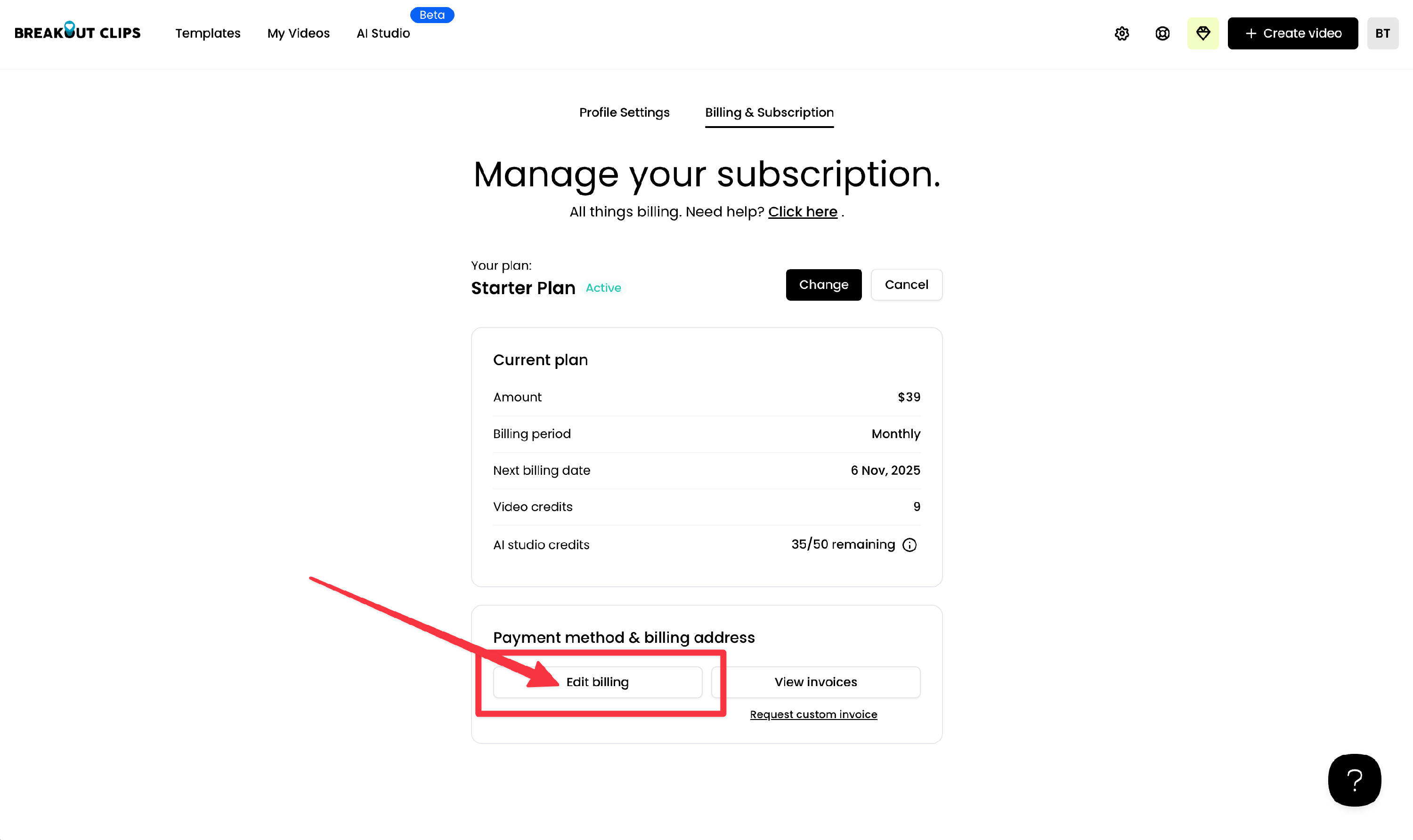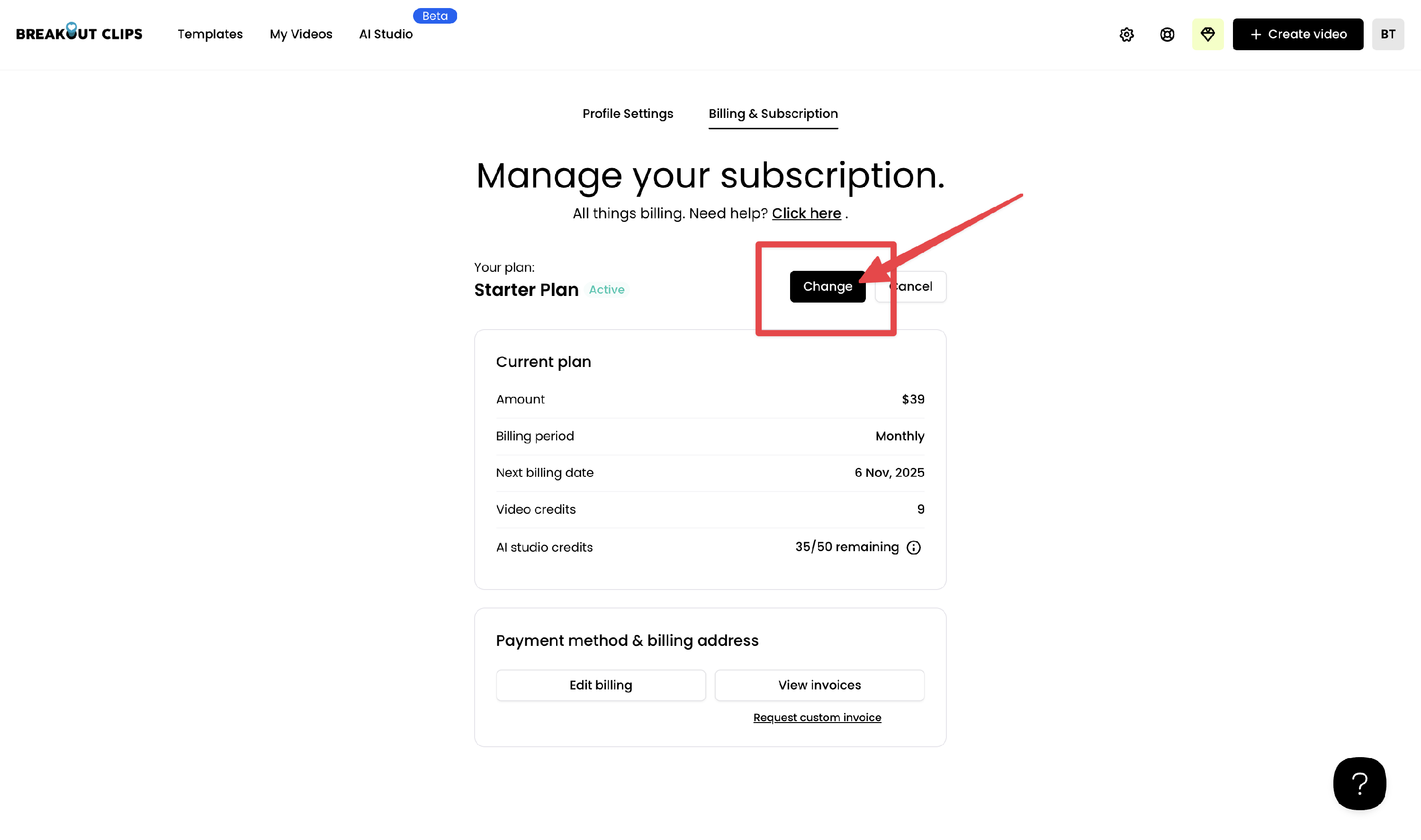 Whether you're looking to change your payment method, upgrade/downgrade your plan, download invoices or anything else billing related, you'll want to head over to your billing dashboard inside Breakout Clips.
