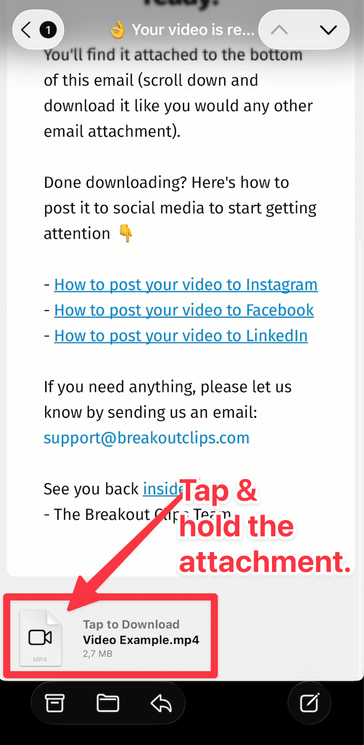 Open the email, and scroll down to view the attachment at the bottom. Tap & hold the attachment.