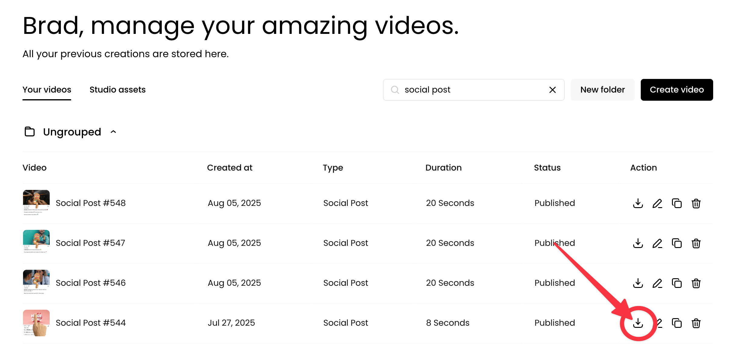 Alternatively, you can go to your video dashboard by clicking My Videos in the top menu and next to your campaign click the Download icon (under the 'Action' column).