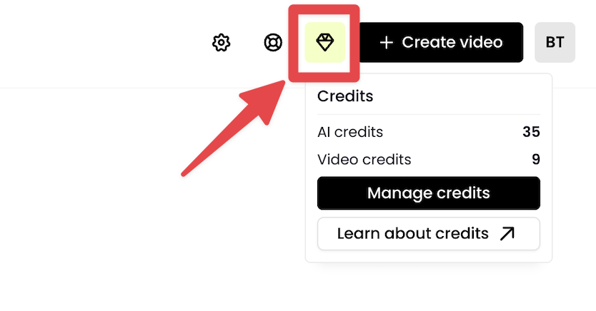 - You can view both your Video Download Credits and AI Studio Credits anytime in your account, by hovering-over, or clicking the diamond icon in the top main menu as shown below: