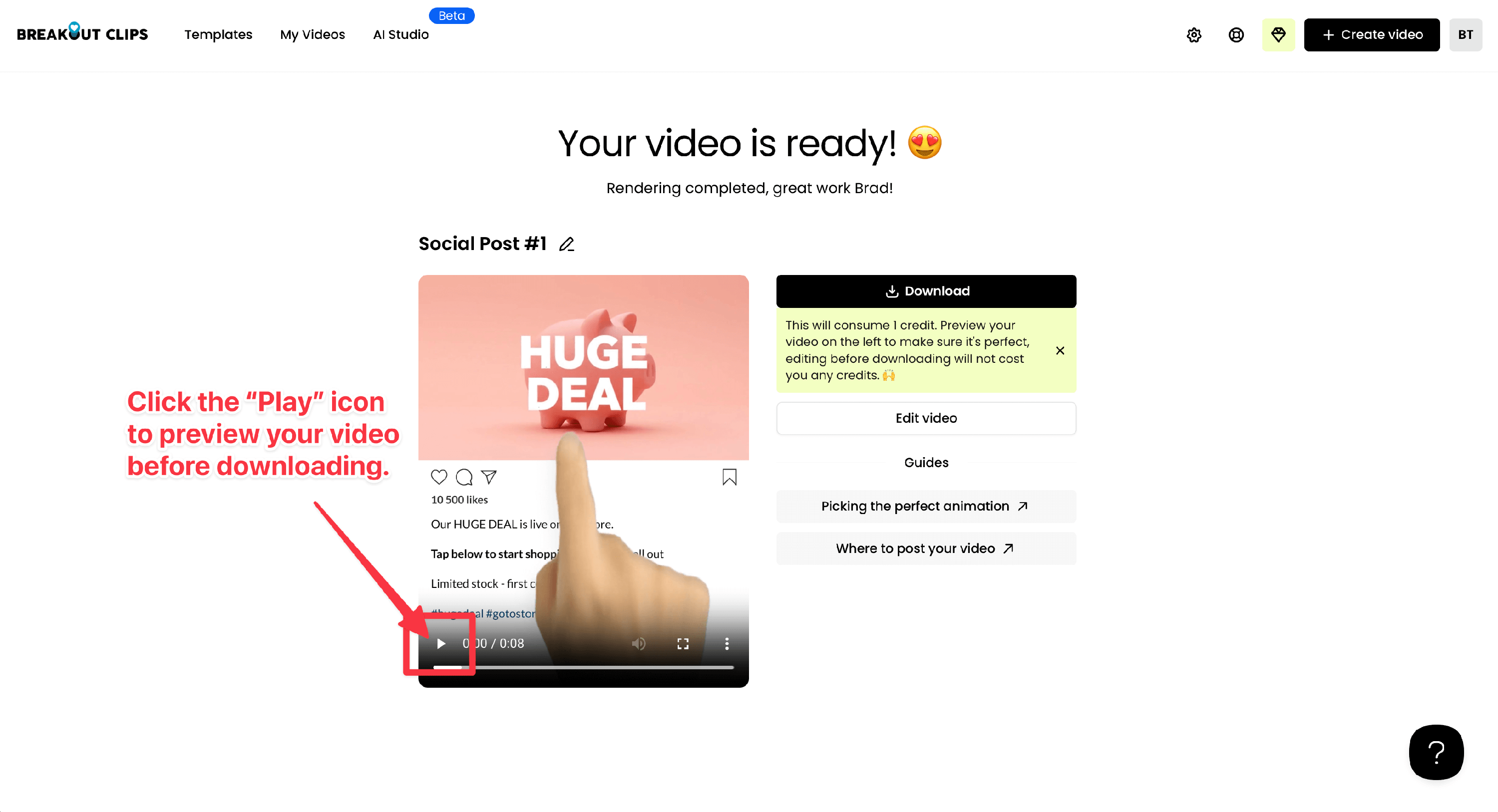 This means you can render your video, see how it looks, and choose to edit it if you need to (without using any credits). When you're happy with how it looks, you can download it and a download credit will be deducted.