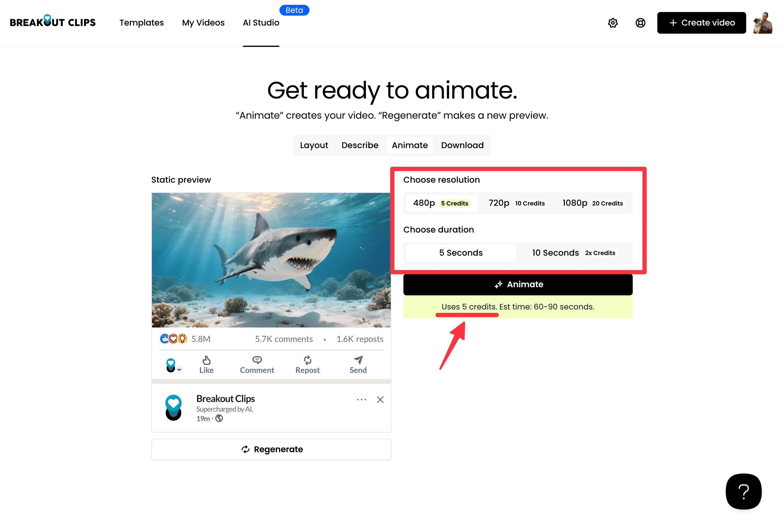 The resolution options clearly show how many AI Credits each setting requires, along with the duration. Directly below the Animate button, we also show you the total number of credits that will be used, based on your settings you've selected for your AI video.