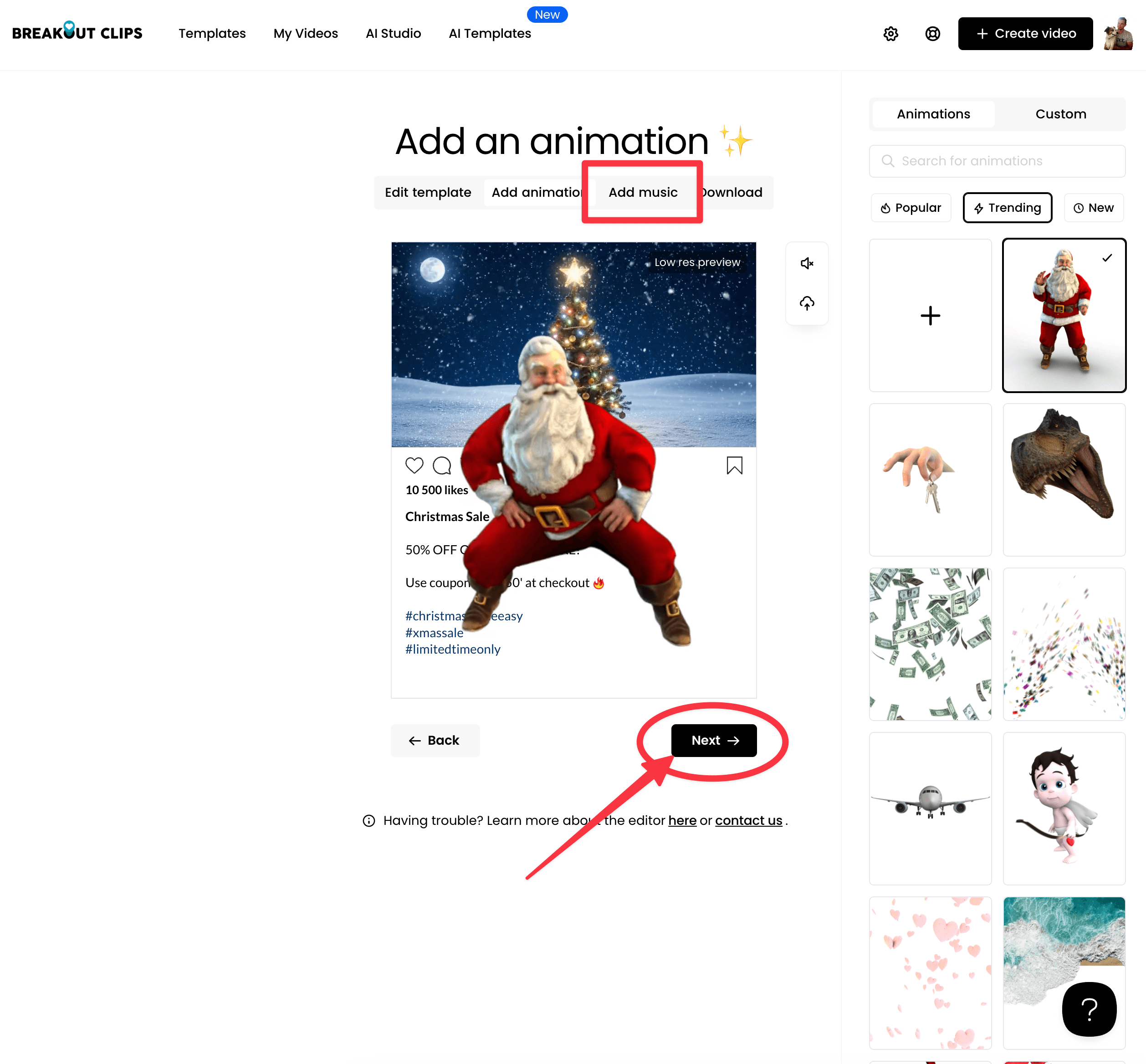 Each animation comes with its own specific audio/sound effect. On the page shown below, you can choose to continue with the animation sound effect, or you can click the Add Music button to browse our thousands of premium music tracks.