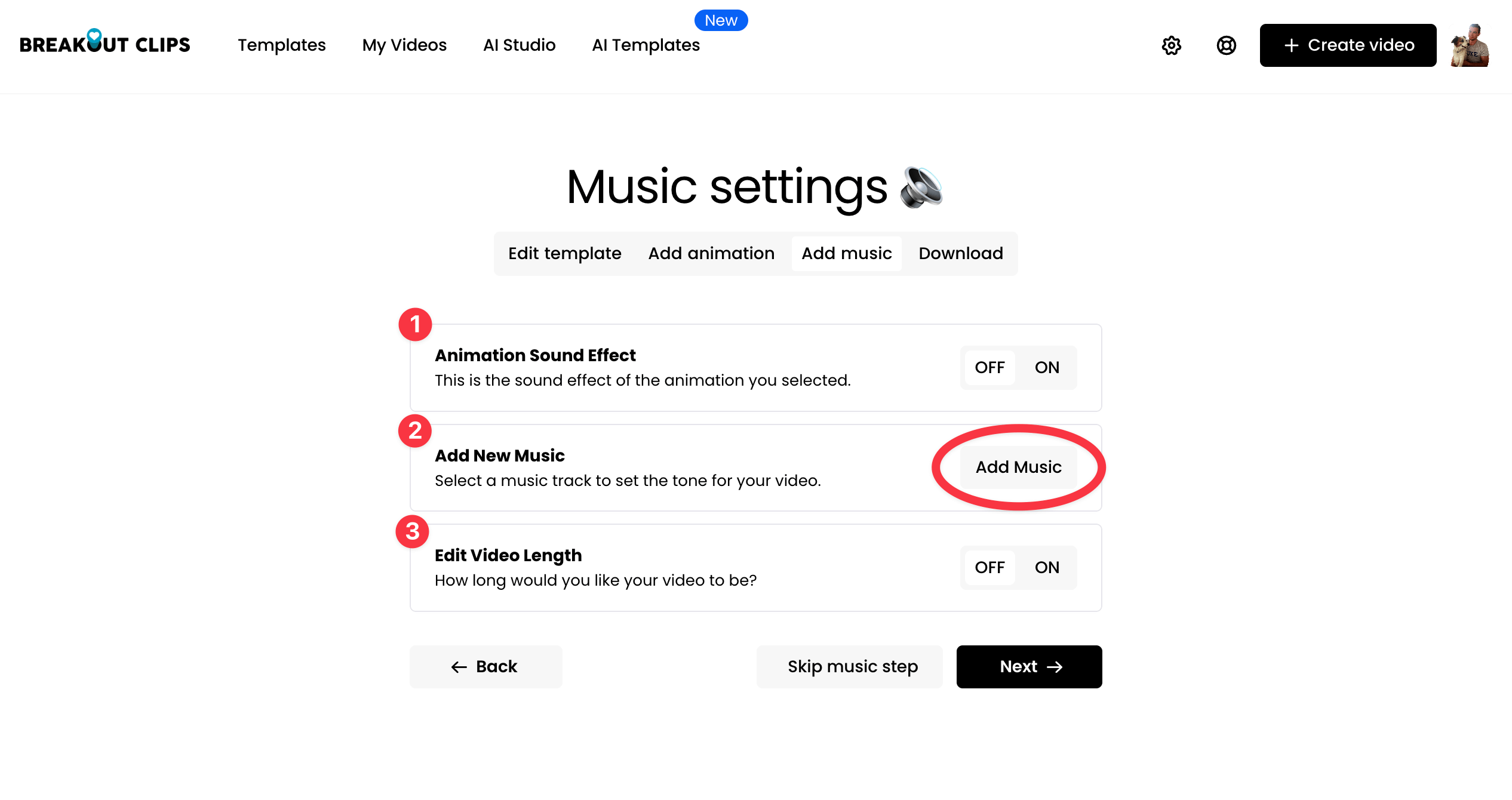 Simply click the "Skip Music Step" button or click the "Next" button without making any edits on this "Add Music" step.