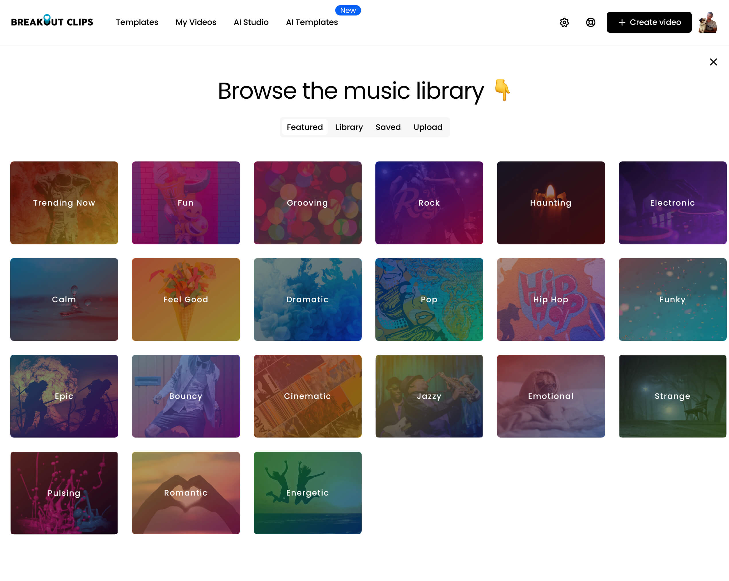 Click the Add Music button to open the music library. A pop-up will open where you can can click any of the collections in the Featured tab.