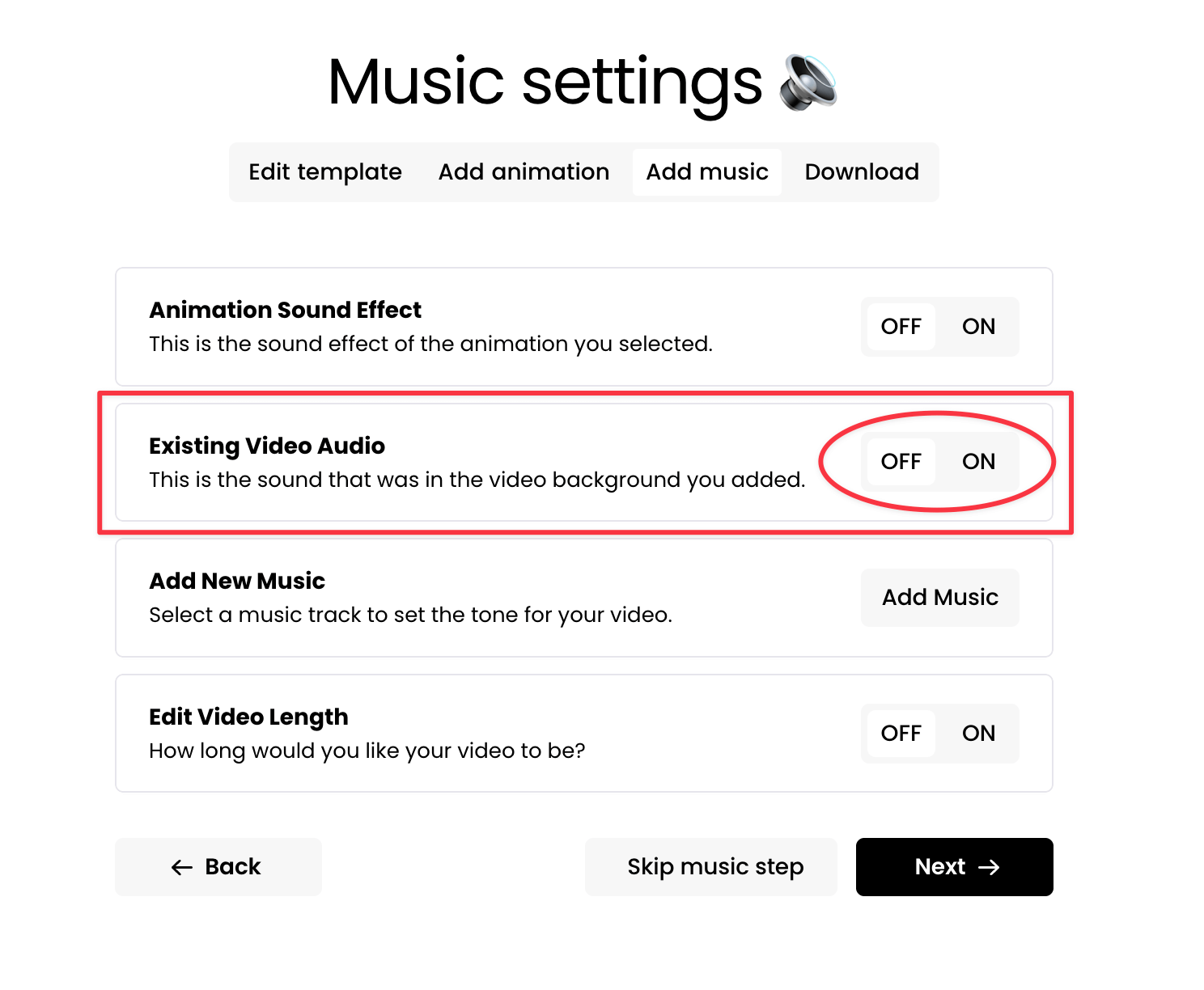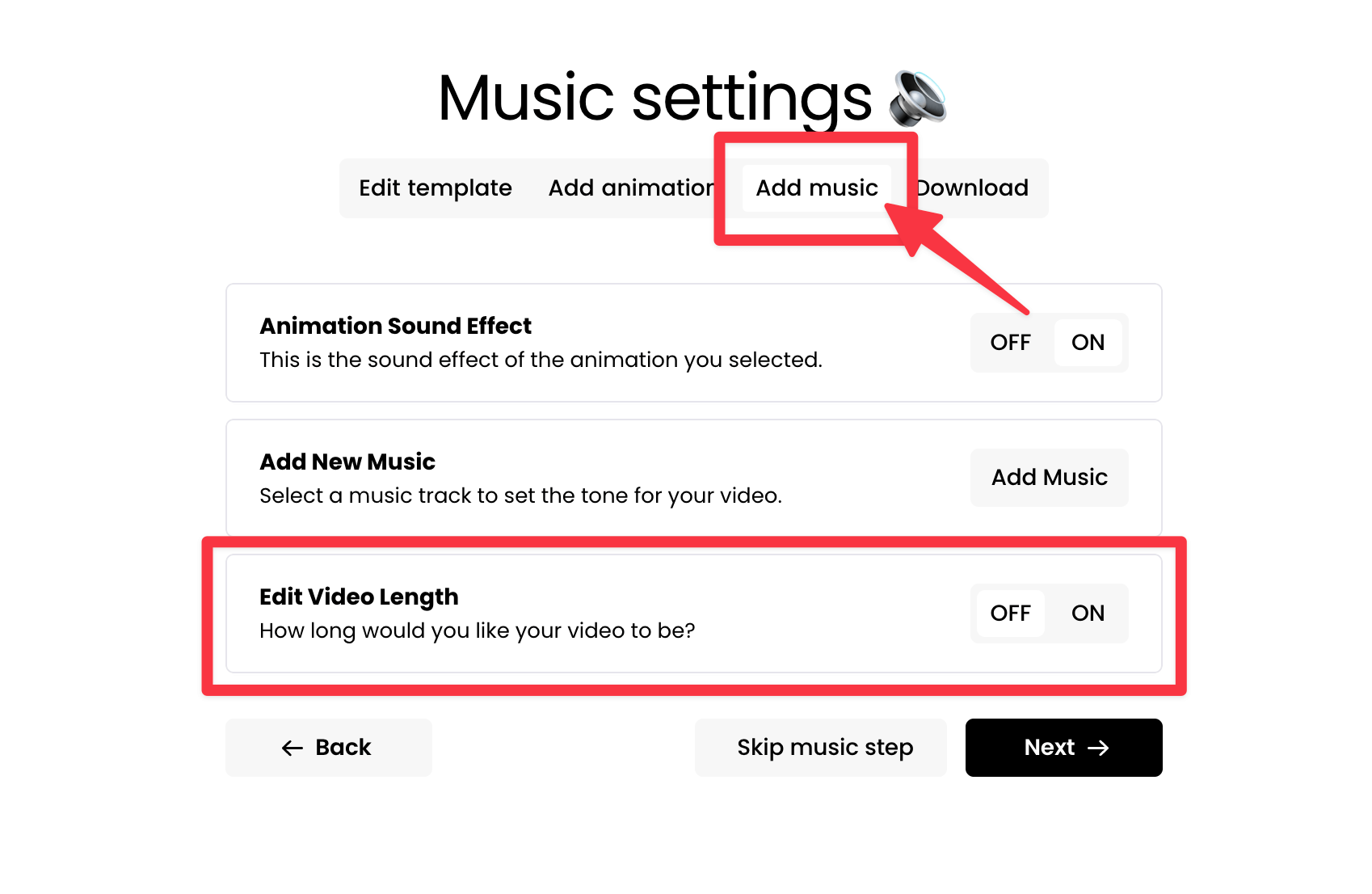 Simply click the "Skip Music Step" button or click the "Next" button without making any edits on this "Add Music" step.