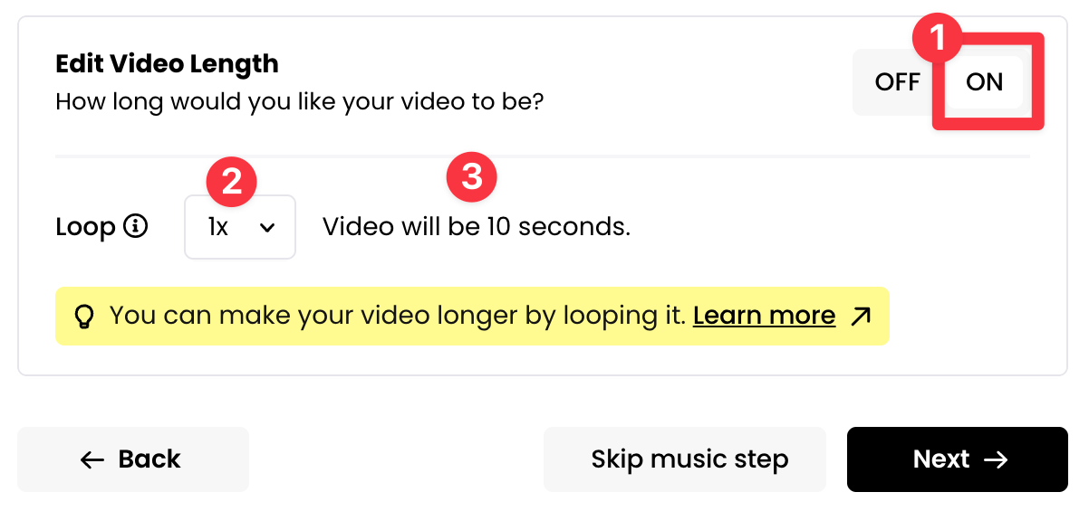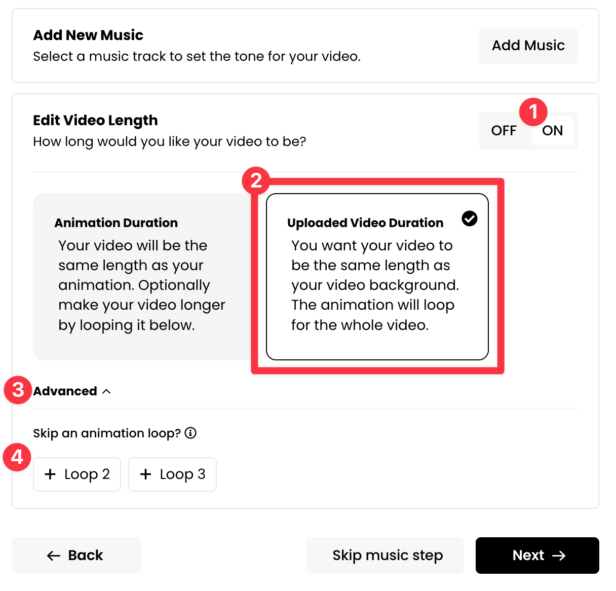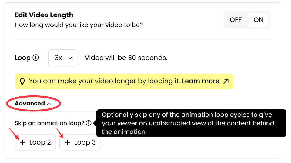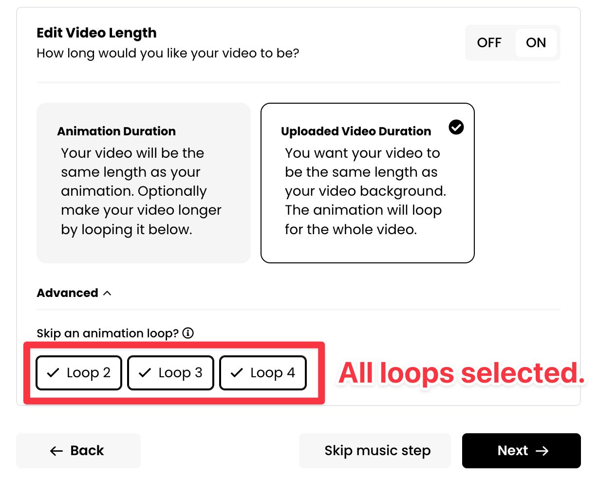 Switching this On is completely optional. If you leave it off, your final video will be the same length as the animation you selected in the previous Add Animation step.