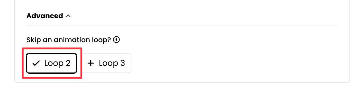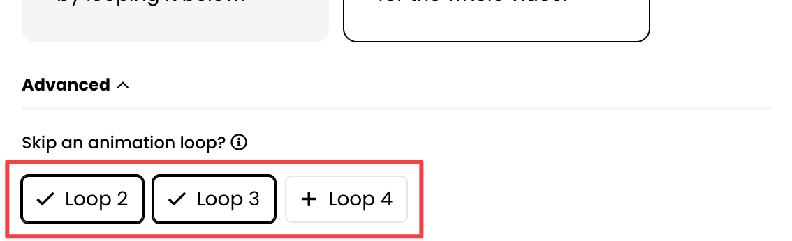 Let's assume you loop your video 3 times (3x). You could then choose to hide the animation for the second loop, but have it return for the third and final loop by clicking "Loop 2" as shown below (the checkmark indicates it will be skipped).