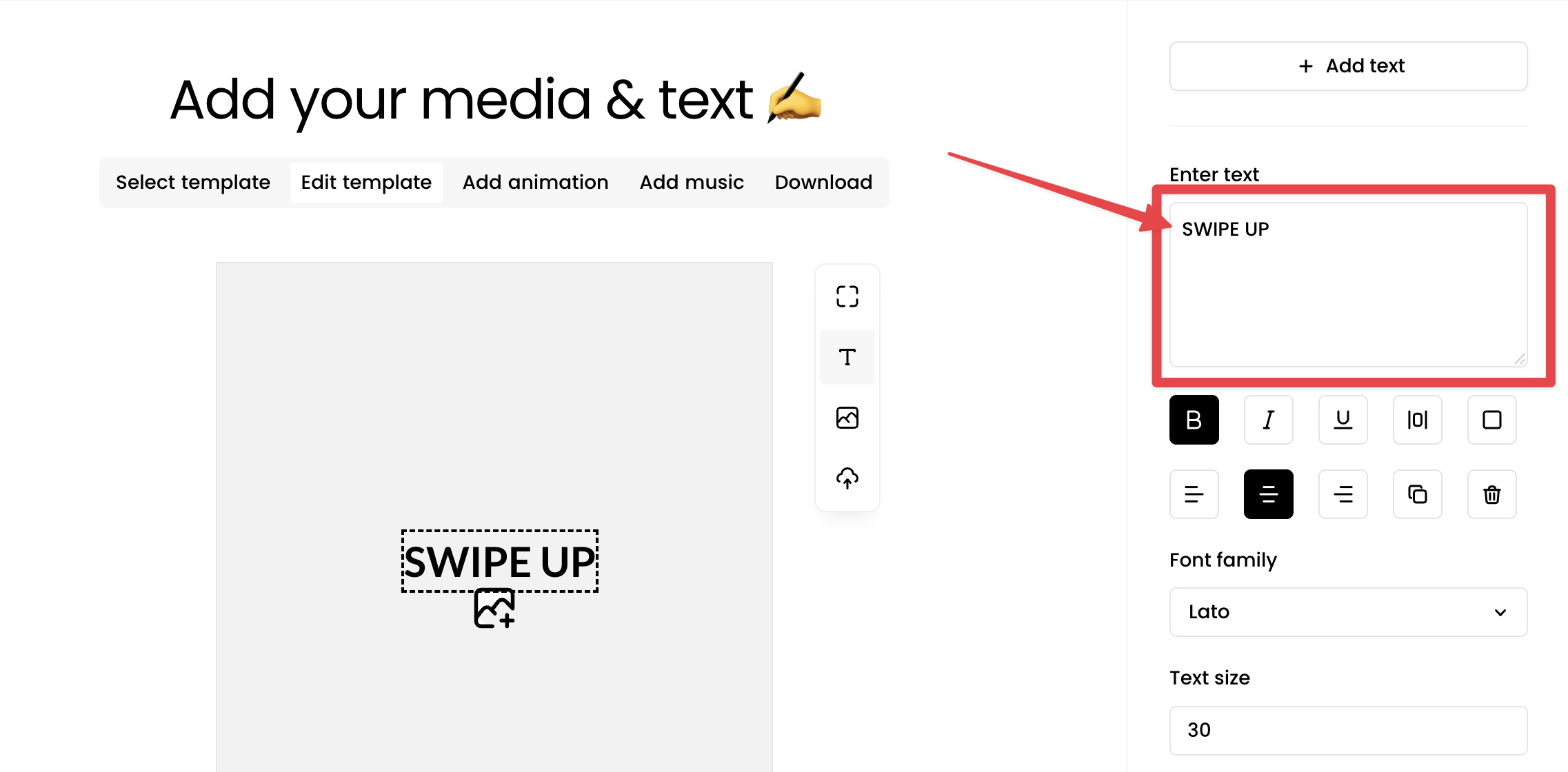 If you tap "Edit" (labelled "1" above), you'll be shown a text field where you can change the text content, as well as all of your basic formatting options such as styling, alignment and text size.
