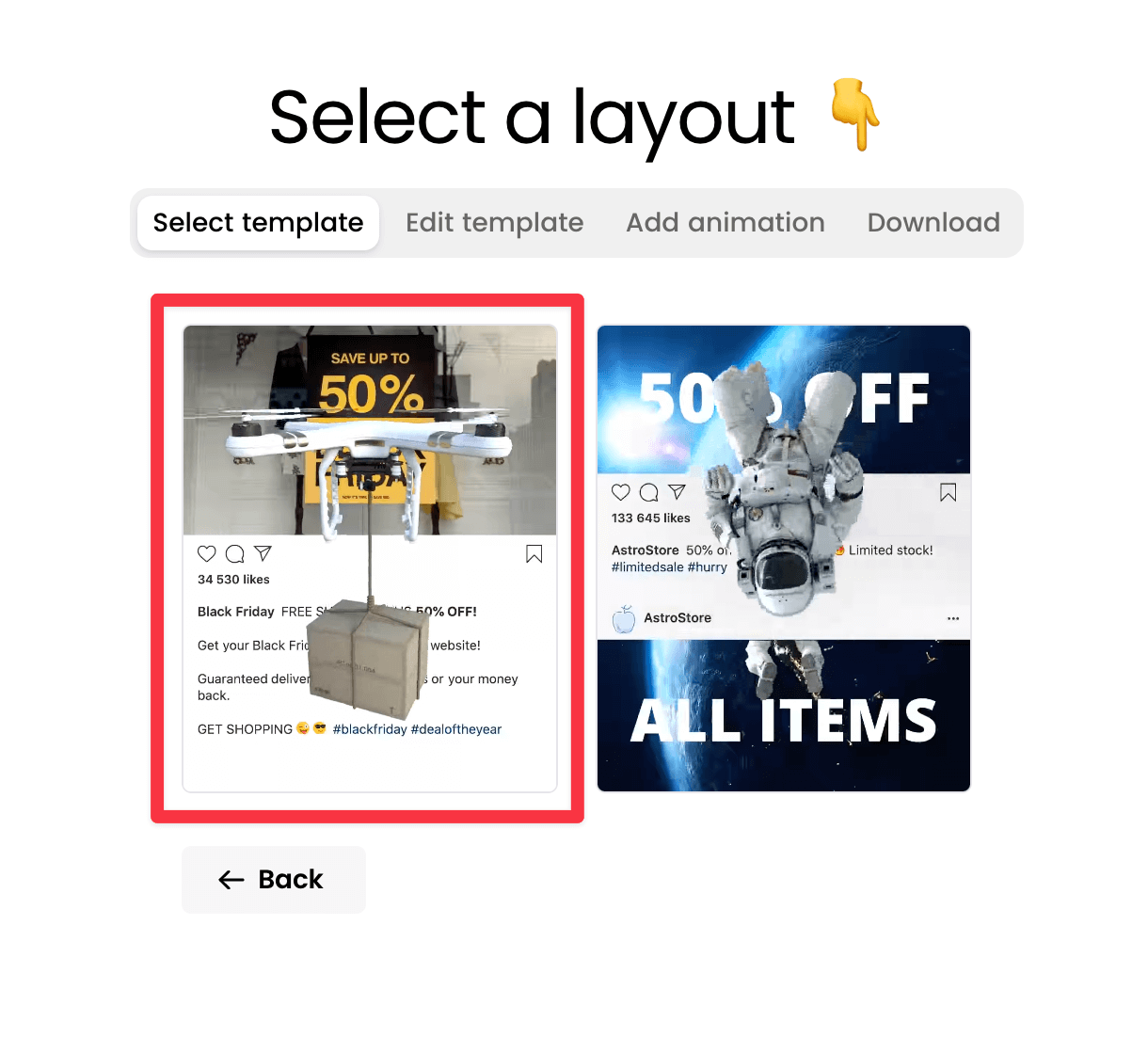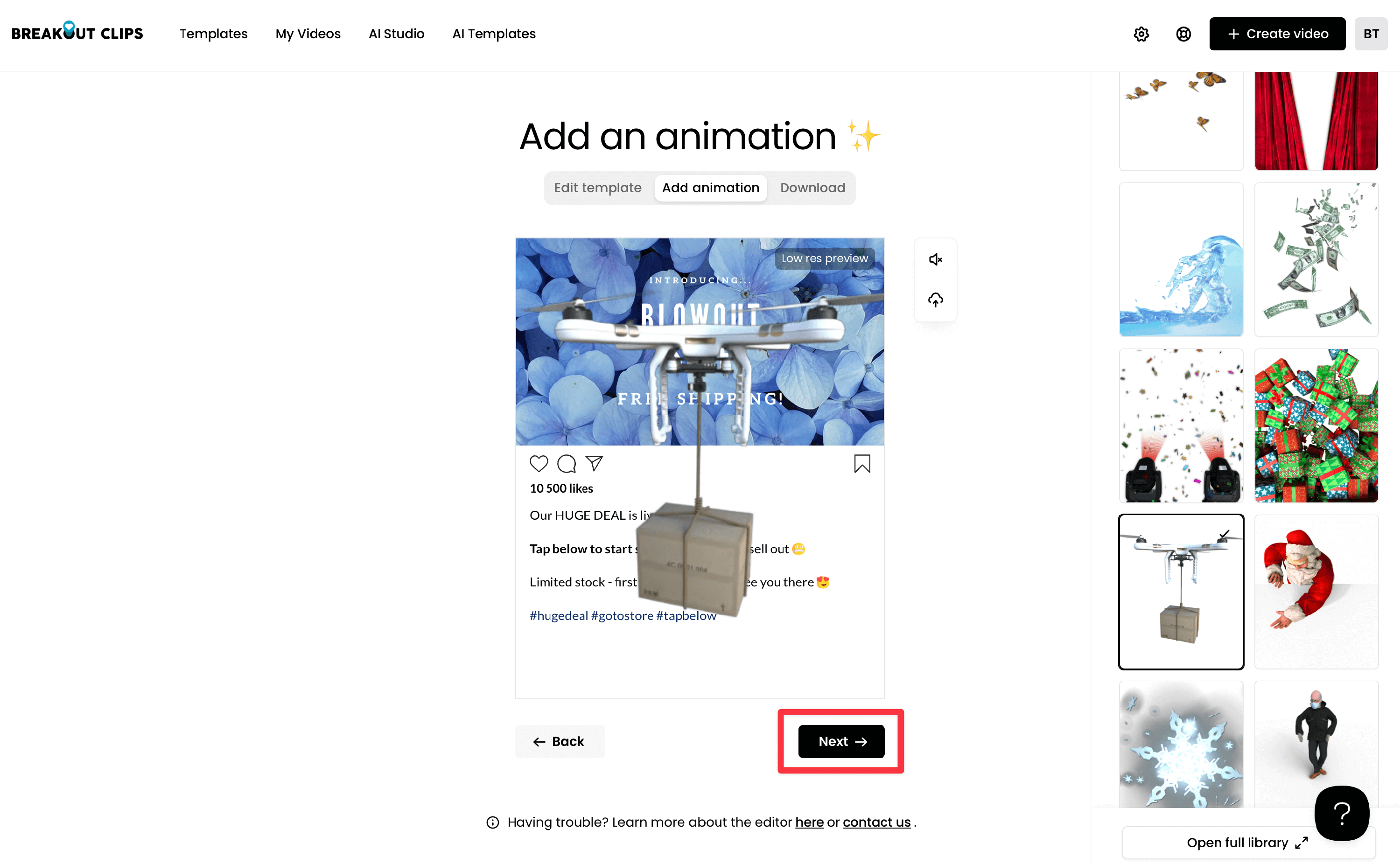 When you select an animation, it'll be added to your post template preview and you'll be able to see exactly how your video will look before it's rendered.