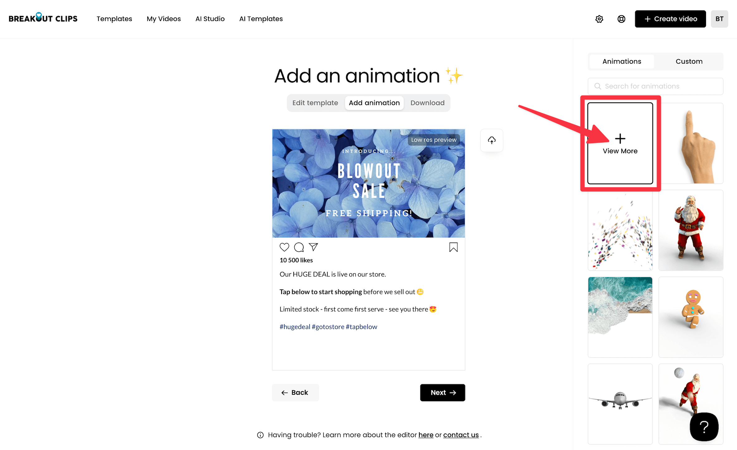 On the right you'll see a sidebar showcasing all our animations (2,000+) you can use. You can search for animations by keyword, or click the first thumbnail ("View More" as shown below) to browse our full library.
