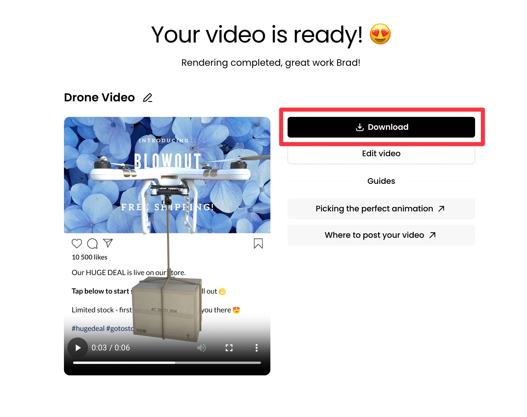 When your video has finished rendering, you'll be shown an option to download your video file.